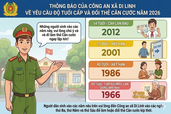 THÔNG TINXem thêm + Công an xã Di Linh thông báo độ tuổi cấp, đổi thẻ Căn cước năm 2026 08:39 17/01/2026 | 89 Danh sách cá nhân được đề nghị xét tặng danh hiệu Nhà giáo ưu tú
