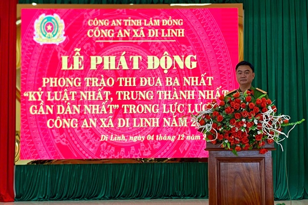 Công an xã Di Linh đã long trọng tổ chức Lễ phát động phong trào thi đua “Ba nhất” 16:49 09/12/2025 | 25 Chiều ngày 04/12/2025, Công an xã Di Linh đã long trọng tổ chức Lễ phát động phong trào thi đua “Ba nhất”. Buổi lễ có sự tham dự của các đồng chí trong Chi ủy, Ban Chỉ huy và toàn thể cán bộ, chiến sĩ (CBCS) Công an xã.
