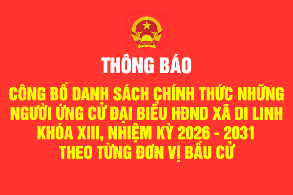 THÔNG BÁO: Về việc niêm yết danh sách cử tri bầu cử đại biểu Quốc hội khóa XVI và bầu cử đại biểu Hội đồng nhân dân các cấp nhiệm kỳ 2026 - 2031 10:00 02/02/2026 | 126 Ủy ban nhân dân xã Di Linh thông báo niêm yết danh sách cử tri bầu cử đại biểu Quốc hội khóa XVI và bầu cử đại biểu Hội đồng nhân dân các cấp nhiệm kỳ 2026 - 2031, cụ thể như sau
