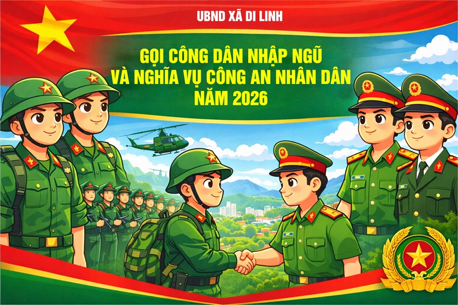TIN NỔI BẬT Di Linh tổ chức Hội nghị giao quyết định gọi công dân nhập ngũ và nghĩa vụ công an nhân dân năm 2026 10:55 11/02/2026 | 29 Một số tình huống pháp luật về chứng thực 08:44 10/02/2026 | 33 Một số tình huống pháp luật về hộ tịch 08:30 10/02/2026 | 32 KỶ NIỆM 96 NĂM NGÀY THÀNH LẬP ĐẢNG CỘNG SẢN VIỆT NAM (3/2/1930 - 3/2/2026) 09:00 03/02/2026 | 102 THÔNG BÁO: Về việc niêm yết danh sách cử tri bầu cử đại biểu Quốc hội khóa XVI và bầu cử đại biểu Hội đồng nhân dân các cấp nhiệm kỳ 2026 - 2031 10:00 02/02/2026 | 91 Xã Di Linh Triển khai Kế hoạch ra quân chấn chỉnh, lập lại trật tự đô thị năm 2026 09:00 02/02/2026 | 65 Di Linh: Ấm áp Lễ đón nhận 28 quân nhân xuất ngũ trở về địa phương 09:36 29/01/2026 | 75 Hướng dẫn kê khai hồ sơ ứng cử và tích hợp thông tin đơn ứng cử, tiểu sử tóm tắt trên Cổng thông tin điện tử của Hội đồng bầu cử Quốc gia 10:47 24/01/2026 | 304 Chúc mừng Đại hội đại biểu toàn quốc lần thứ XIV của Đảng thành công rực rỡ 16:46 23/01/2026 | 136 Thôn 10, xã Di Linh: Hiệu quả từ mô hình camera an ninh 08:32 23/01/2026 | 67