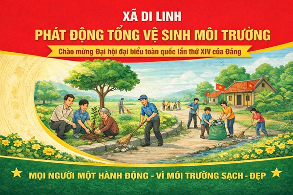 Xã Di Linh đồng loạt ra quân tổng vệ sinh môi trường chào mừng Đại hội đại biểu toàn quốc lần thứ XIV của Đảng 08:25 18/01/2026 | 38 Sáng ngày 17 tháng 1 năm 2026, trong không khí phấn khởi những ngày đầu năm mới, toàn bộ hệ thống chính trị và nhân dân xã Di Linh đã đồng loạt ra quân tổng vệ sinh môi trường. Đây là hoạt động cao điểm nhằm tạo khí thế thi đua sôi nổi, góp phần xây dựng cảnh quan nông thôn sáng – xanh – sạch – đẹp, hướng tới chào mừng Đại hội đại biểu toàn quốc lần thứ XIV của Đảng.