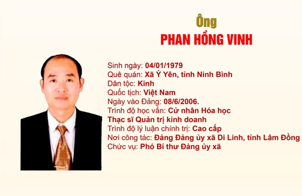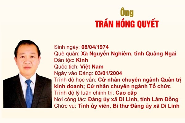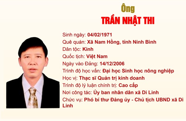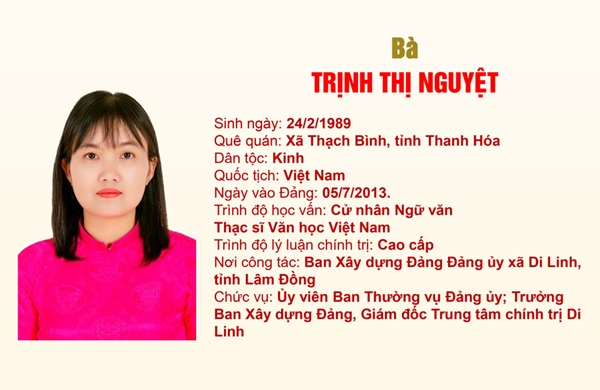 Tóm tắt tiểu sử: Đồng chí Trần Hồng Quyết - Tỉnh ủy viên, Bí thư Đảng ủy xã Di Linh  5 giờ trước |   16 Tóm tắt tiểu sử: Đồng chí Trần Nhật Thi - Phó Bí thư Đảng ủy, Chủ tịch UBND xã Di Linh  5 giờ trước |   14 Tóm tắt tiểu sử: Đồng chí Phan Hồng Vinh - Phó Bí thư thường trực Đảng ủy xã Di Linh  5 giờ trước |   9 Tóm tắt tiểu sử: Đồng chí Trịnh Thị Nguyệt - Trưởng Ban xây dựng Đảng; Giám đốc Trung tâm chính trị Di Linh  5 giờ trước |   12