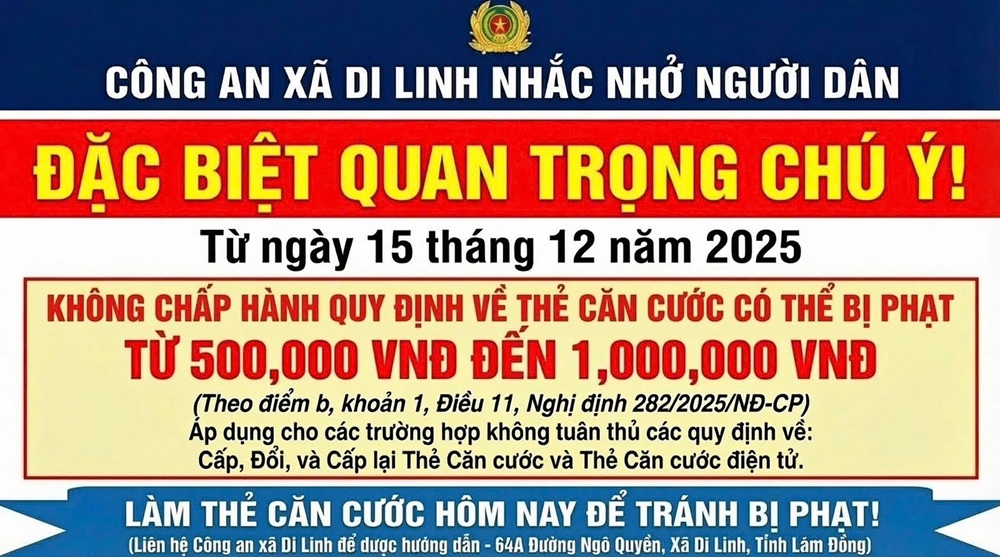 Công an xã Di Linh thông báo về yêu cầu độ tuổi cấp và đổi thẻ căn cước năm 2026 - Người dân đến Công an xã Di linh làm căn cước công dân vào các ngày trong tuần: Thứ 3, Thứ 5, Thứ 6 Lưu ý đặc biệt quan trọng nhắc nhở người dân: - Từ ngày 15/12/2025 nếu không chấp hành quy định về thẻ căn cước có thể bị phạt từ 500.000 đến 1.000.000 VNĐ - Làm thẻ căn cước ngay hôm nay để tránh bị phạt, liên hệ ngay Công an xã Di Linh - 64A đường Ngô Quyền, xã Di Linh, tỉnh Lâm Đồng)