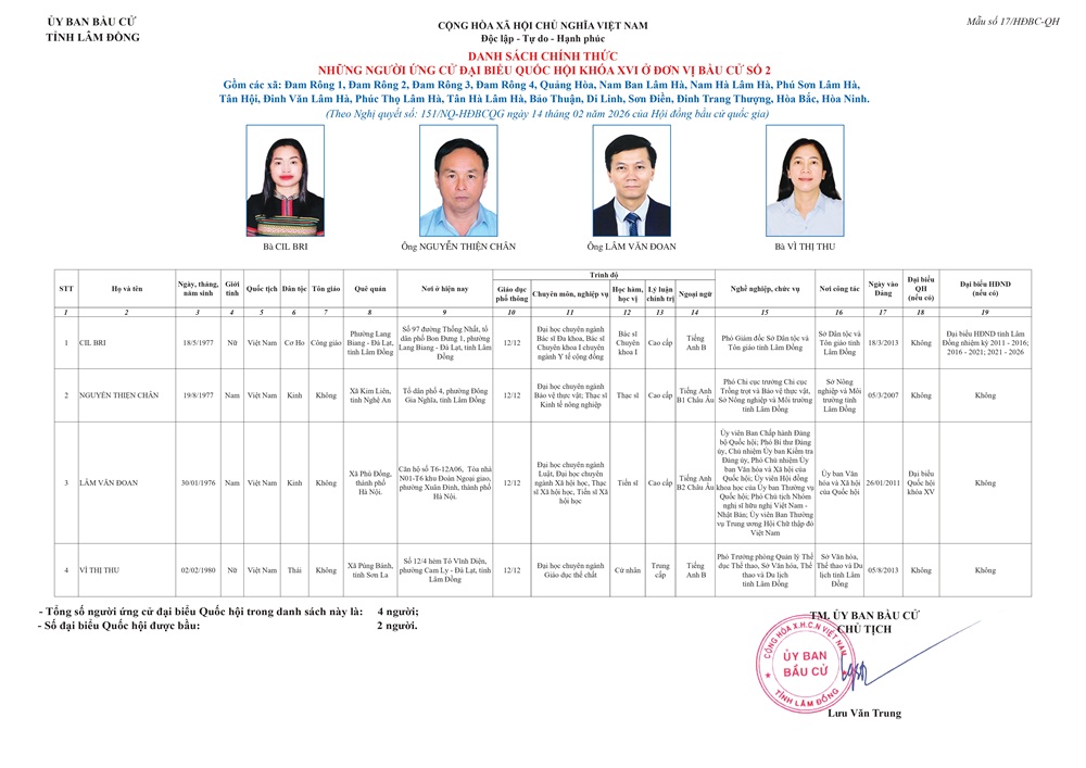 Bầu cử Công bố danh sách chính thức người ứng cử đại biểu Quốc hội khóa XVI tại tỉnh Lâm Đồng - Đơn vị bầu cử số 2 Your browser does not support the audio element.   02/03/2026 11:28 |   74 |  Thực hiện Nghị quyết số 151/NQ-HĐBCQG do Trần Thanh Mẫn – Chủ tịch Quốc hội ký ban hành, Hội đồng Bầu cử Quốc gia đã công bố danh sách chính thức những người ứng cử đại biểu Quốc hội khóa XVI trên phạm vi cả nước. TẠI ĐƠN VỊ BẦU CỬ SỐ 2 GỒM CÓ 4 ĐẠI BIỂU ỨNG CỬ NHƯ SAU: Theo Nghị quyết, cả nước có 864 người ứng cử tại 182 đơn vị bầu cử, để bầu 500 đại biểu Quốc hội khóa XVI. Nghị quyết có hiệu lực kể từ ngày ký ban hành. Tại tỉnh Lâm Đồng, có 29 người ứng cử tại 06 đơn vị bầu cử, để bầu 17 đại biểu Quốc hội, nhiệm kỳ 2026 - 2031. Việc công bố danh sách chính thức người ứng cử là cơ sở quan trọng để cử tri nghiên cứu, tìm hiểu thông tin và thực hiện quyền, nghĩa vụ công dân trong cuộc bầu cử đại biểu Quốc hội sắp tới. Từ khóa Liên kết Người ứng cử đại biểu Quốc hội khóa XVI tại tỉnh Lâm Đồng