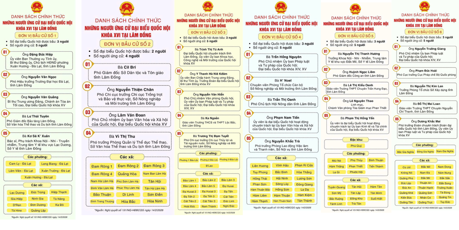 Bầu cử Công bố danh sách chính thức người ứng cử đại biểu Quốc hội khóa XVI tại tỉnh Lâm Đồng Your browser does not support the audio element.   02/03/2026 11:28 |   33 |  Thực hiện Nghị quyết số 151/NQ-HĐBCQG do Trần Thanh Mẫn – Chủ tịch Quốc hội ký ban hành, Hội đồng Bầu cử Quốc gia đã công bố danh sách chính thức những người ứng cử đại biểu Quốc hội khóa XVI trên phạm vi cả nước. Theo Nghị quyết, cả nước có 864 người ứng cử tại 182 đơn vị bầu cử, để bầu 500 đại biểu Quốc hội khóa XVI. Nghị quyết có hiệu lực kể từ ngày ký ban hành. Tại tỉnh Lâm Đồng, có 29 người ứng cử tại 06 đơn vị bầu cử, để bầu 17 đại biểu Quốc hội, nhiệm kỳ 2026 - 2031. Việc công bố danh sách chính thức người ứng cử là cơ sở quan trọng để cử tri nghiên cứu, tìm hiểu thông tin và thực hiện quyền, nghĩa vụ công dân trong cuộc bầu cử đại biểu Quốc hội sắp tới. Từ khóa Liên kết Người ứng cử đại biểu Quốc hội khóa XVI tại tỉnh Lâm Đồng