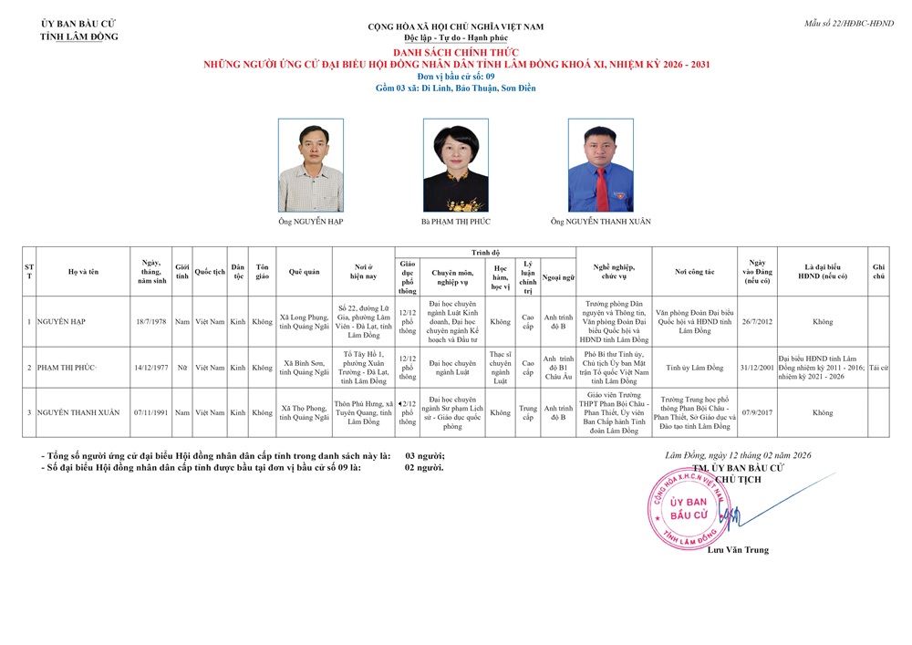 Công bố danh sách chính thức những người ứng cử đại biểu Hội đồng nhân dân Tỉnh Lâm Đồng khóa XI, nhiệm kỳ 2026 - 2031 (Đơn vị bầu cử số 9) gồm các xã Di Linh, Bảo Thuận và Sơn Điền ĐƠN VỊ BẦU CỬ SỐ 9 GỒM 03 ĐẠI BIỂU ỨNG CỬ NHƯ SAU: 1. ÔNG: NGUYỄN HẠP - TRƯỞNG PHÒNG DÂN NGUYỆN VÀ THÔNG TIN, VĂN PHÒNG ĐOÀN ĐẠI BIỂU QUỐC HỘI VÀ HĐND TỈNH LÂM ĐỒNG 2. BÀ: PHẠM THỊ PHÚC - PHÓ BÍ THƯ TỈNH ỦY, CHỦ TỊCH UBMTTQVN TỈNH LÂM ĐỒNG 3. ÔNG: NGUYỄN THANH XUÂN - GIÁO VIÊN TRƯỜNG THPT PHAN BỘI CHÂU - PHAN THIẾT, ỦY VIÊN BCH TỈNH ĐOÀN LÂM ĐỒNG