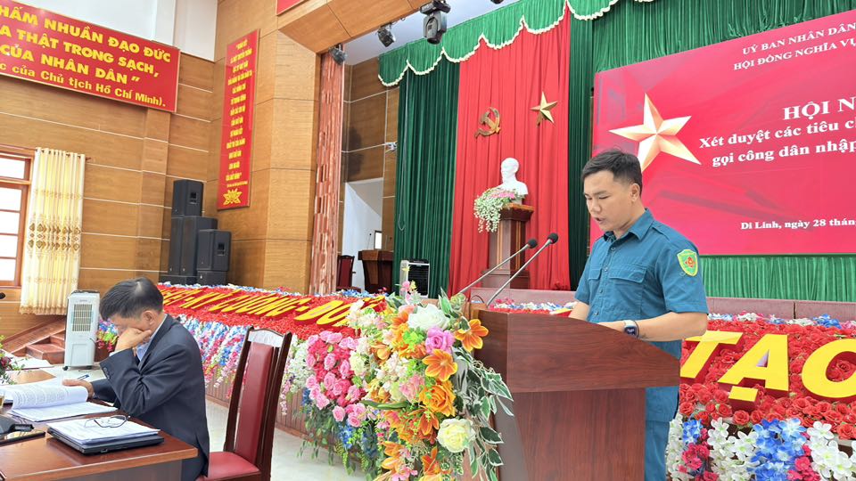 An ninh - Quốc phòng Hội đồng Nghĩa vụ quân sự xã Di Linh đã tổ chức Hội nghị xét duyệt các tiêu chuẩn tuyển chọn công dân trong độ tuổi sẵn sàng nhập ngũ năm 2026 Your browser does not support the audio element.   28/08/2025 17:03 |   25 |  Sáng ngày 28/8/2025 Hội đồng Nghĩa vụ quân sự xã Di Linh đã tổ chức Hội nghị xét duyệt các tiêu chuẩn tuyển chọn công dân trong độ tuổi sẵn sàng nhập ngũ năm 2026. Dự Hội nghị có đồng chí Phạm Hồng Quyết - Tỉnh ủy viên, Bí thư Đảng ủy, Chủ tịch Hội đồng nhân dân xã. đồng chí trung tá Phạm Đức Văn - Phó chỉ huy trưởng Ban chỉ huy phòng thủ khu vực 3 - Bảo Lâm. Hội nghị đã diễn ra công khai, minh bạch, đúng quy trình, đảm bảo công bằng trong công tác tuyển chọn công dân thực hiện nghĩa vụ quân sự. Đây là bước chuẩn bị quan trọng nhằm lựa chọn nguồn thanh niên ưu tú, sẵn sàng lên đường bảo vệ Tổ quốc trong mùa tuyển quân năm 2026. Nghĩa vụ quân sự – Niềm vinh dự, trách nhiệm thiêng liêng của tuổi trẻ đối với quê hương, đất nước. Trích từ nguồn: (Ban CHQS xã Di Linh)