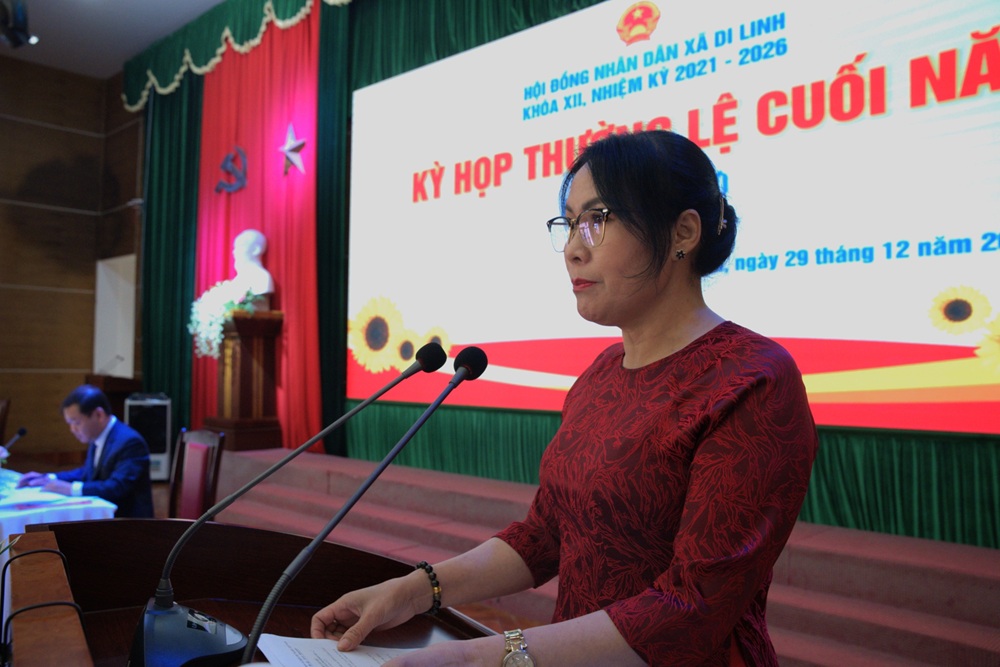 Theo báo cáo trình tại kỳ họp, năm 2025 tình hình kinh tế – xã hội xã Di Linh tiếp tục ổn định và phát triển với nhiều kết quả nổi bật. Tổng thu ngân sách nhà nước do xã quản lý đạt trên 226 tỷ đồng, bằng 244% kế hoạch được giao. Giá trị sản xuất bình quân trên 1 ha canh tác đạt khoảng 350 triệu đồng. Thu nhập bình quân đầu người ước đạt 80 triệu đồng/người/năm. Tỷ lệ lao động qua đào tạo đạt 80%; tỷ lệ người dân tham gia bảo hiểm y tế đạt 90%. Công tác giảm nghèo đạt kết quả rõ nét với tỷ lệ hộ nghèo giảm 0,73%. Trong lĩnh vực đầu tư công, tỷ lệ giải ngân đạt khoảng 92% kế hoạch. Có 95% trường học công lập đạt chuẩn quốc gia; 100% rác thải sinh hoạt khu dân cư được thu gom, xử lý.