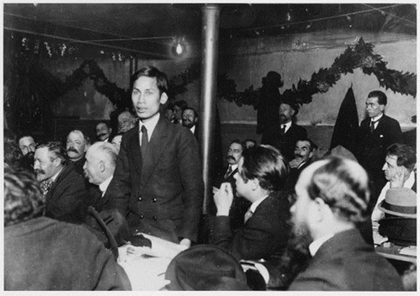 Đồng chí Nguyễn Ái Quốc phát biểu tại Đại hội lần thứ XVIII của Đảng Xã hội Pháp ở Tours, tháng 12/1920. (Ảnh tư liệu: congan.com.vn)
