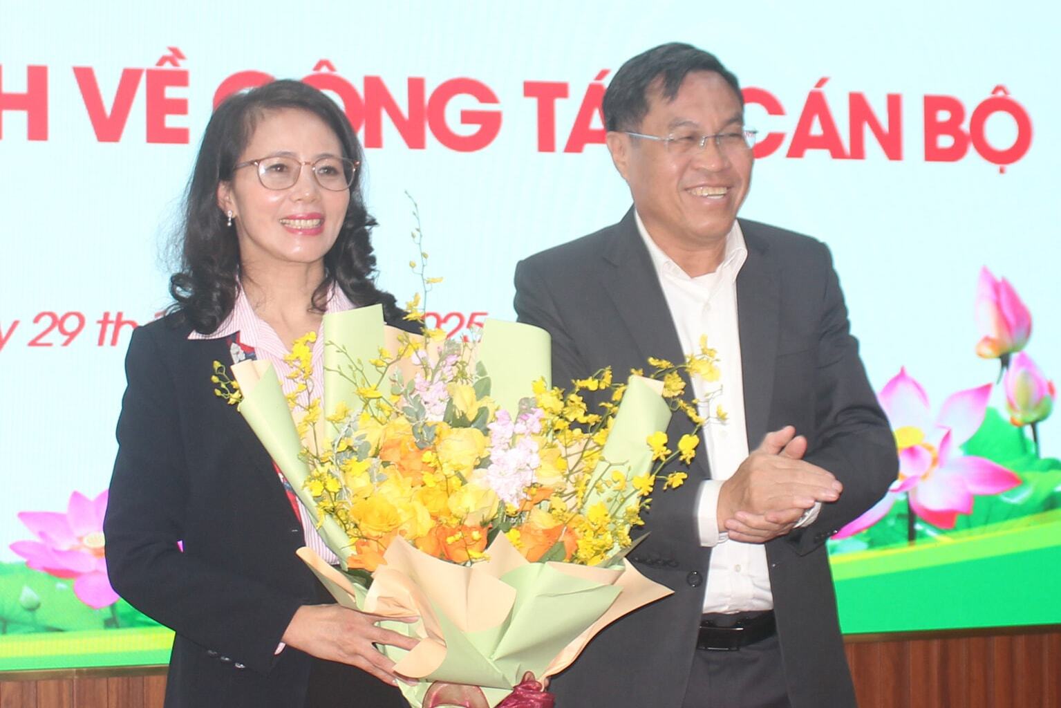 Phó Chủ tịch UBND tỉnh Lâm Đồng Võ Ngọc Hiệp tặng hoa chúc mừng Tân Giám đốc Chi nhánh NHCSXH tỉnh Lâm Đồng Nguyễn Thị Ngọc Thu