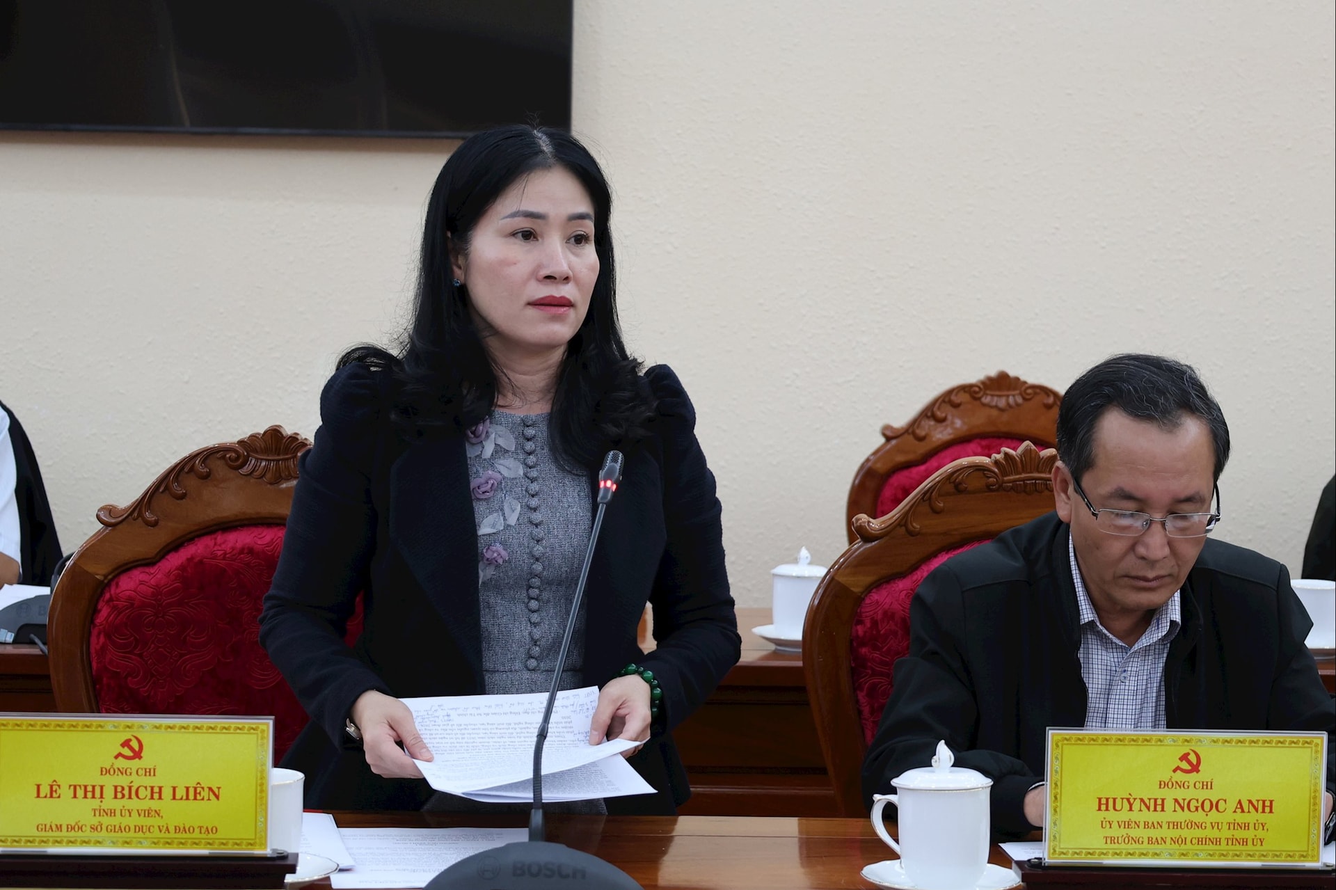 Giám đốc Sở Giáo dục - Đào tạo Lê Thị Bích Liên báo cáo về việc đổi mới sáng tạo và chuyển đổi số trong ngành Giáo dục