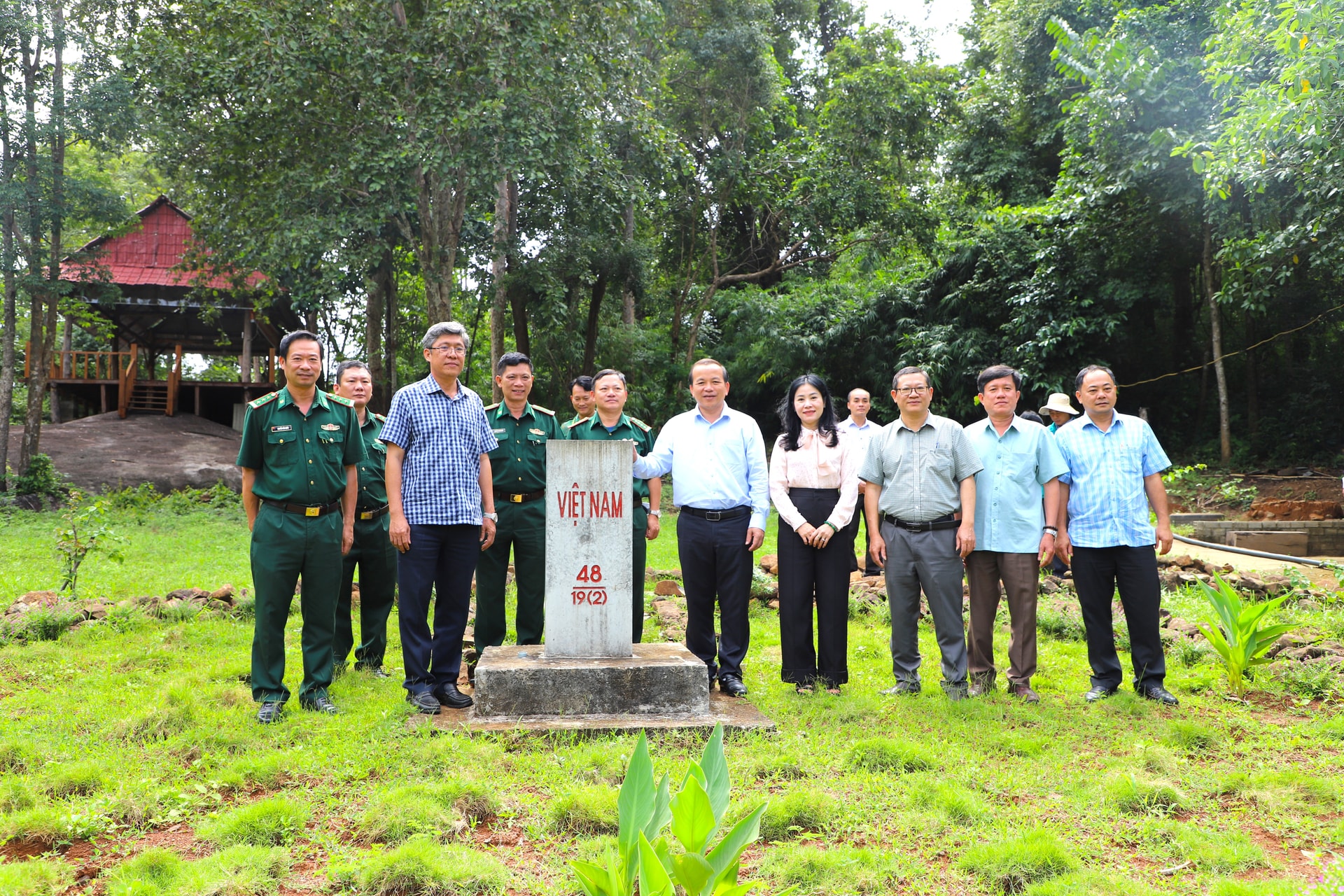 Đoàn công tác chụp hình lưu niệm tại cột mốc phụ 48/18(2) do Đồn Biên phòng Đắk Mbai quản lý, bảo vệ