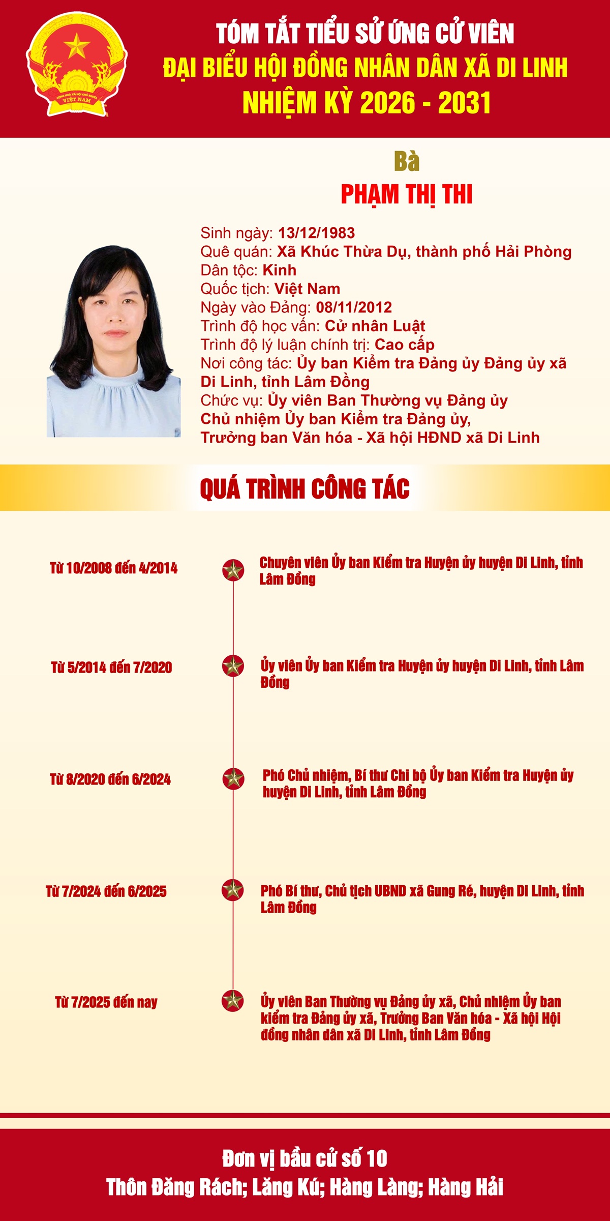 Bà: Phạm Thị Thi Chức vụ: Ủy viên Ban Thường vụ Đảng ủy Chủ nhiệm Ủy ban Kiểm tra Đảng ủy, Trưởng ban Văn hóa - Xã hội HĐND xã Di Linh Đơn vị bầu cử số 10: Gồm các thôn: Đăng Rách; Lăng Kú; Hàng Làng; Hàng Hải Ngày bầu cử: Chủ nhật ngày 15 tháng 03 năm 2026