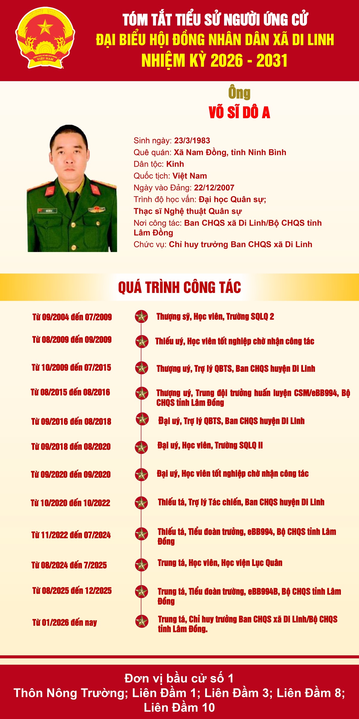 Bầu cửTiểu sử tóm tắt Tóm tắt tiểu sử: Đồng chí Võ Sĩ Dô A - Chỉ huy trưởng Ban CHQS xã Di Linh Your browser does not support the audio element.   09/03/2026 22:54 |   26 |  Ông: Võ Sĩ Dô A Chức vụ: Chỉ huy trưởng Ban CHQS xã Di Linh Đơn vị bầu cử số 01: Gồm các thôn: Nông Trường, Liên Đầm 1, Liên Đầm 3, Liên Đầm 8, Liên Đầm 10 Ngày bầu cử: Chủ nhật ngày 15 tháng 03 năm 2026
