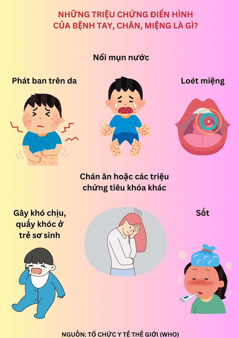 Loét miệng: Các vết loét đau xuất hiện trong miệng, trên lợi hoặc lưỡi khiến trẻ biếng ăn, quấy khóc.